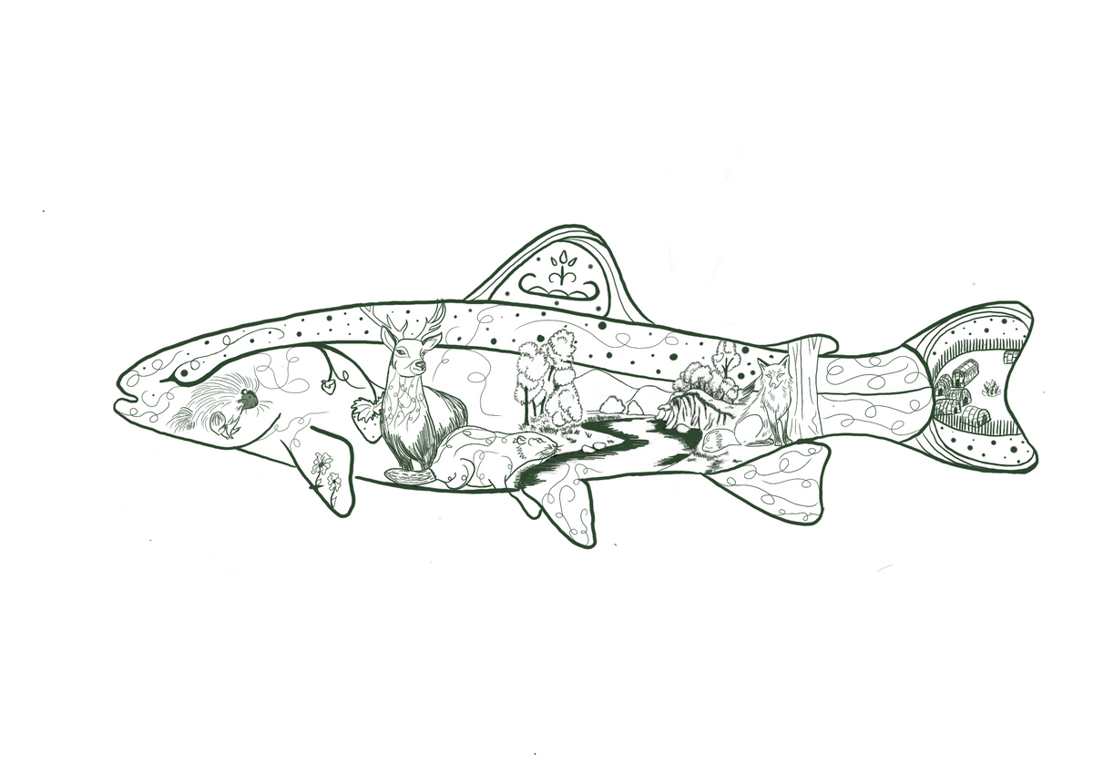 This design features the outline of a rainbow trout, symbolizing the strength and vitality of the fresh waters that surround us, and honoring the life they sustain. Within the trout's form, you'll find woodland animals native to the Northeast, scenes of a traditional village and subtle touches of traditional patterns woven into the background.